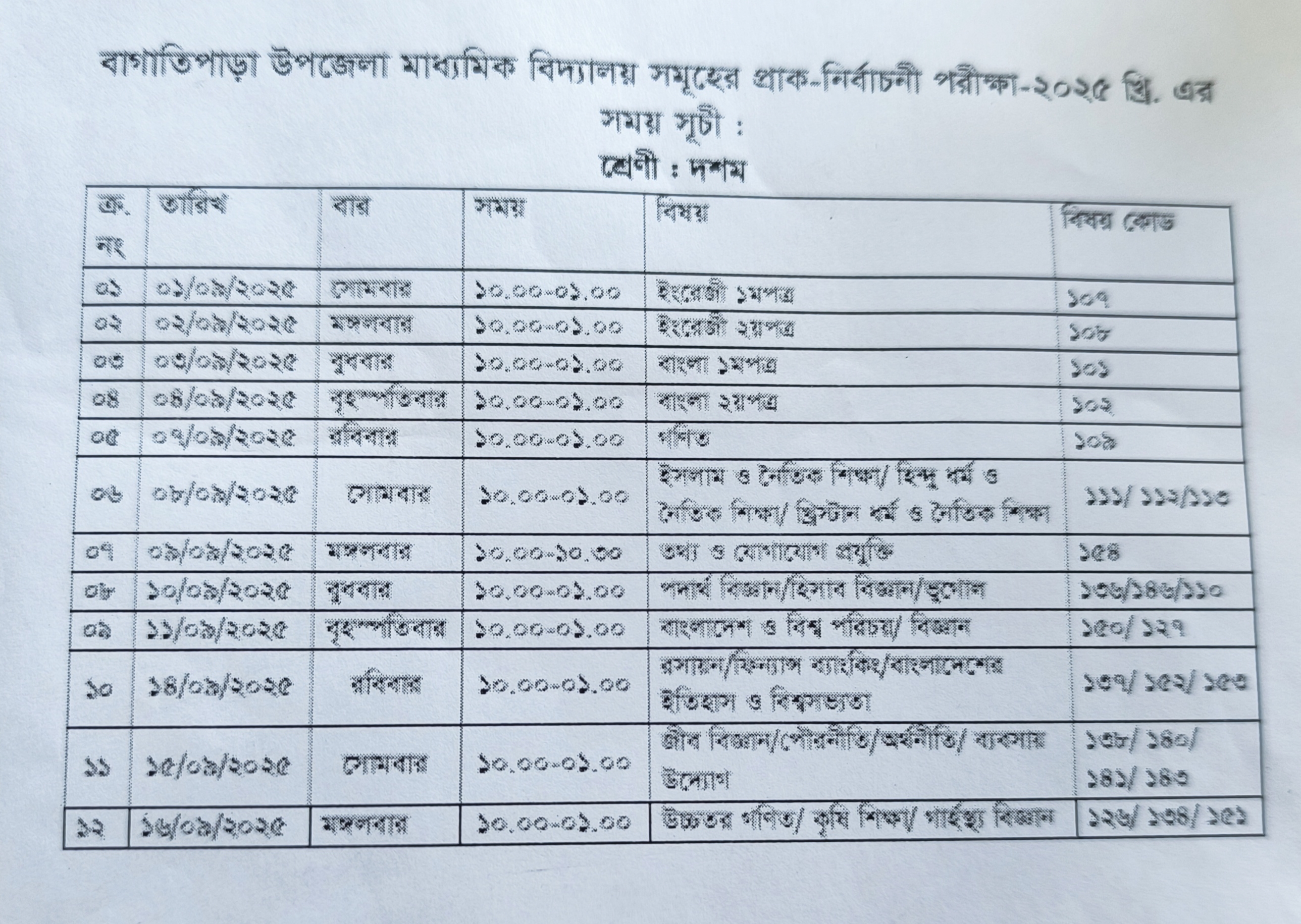 বিষয়ঃ: দশম শ্রেনীর প্রাক-নির্বাচনী পরীক্ষার রুটিন